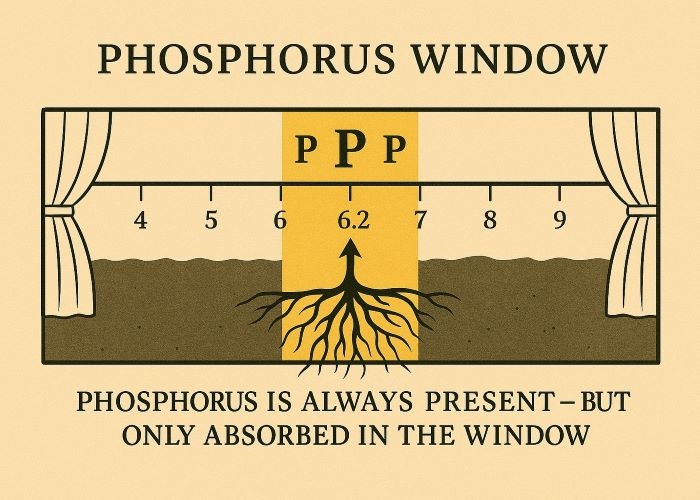 - Ґрунтові субстрати: оптимальний діапазон — 6.0–7.0, оскільки в цій зоні фосфор зберігає біодоступність, не випадаючи в нерозчинні сполуки.
