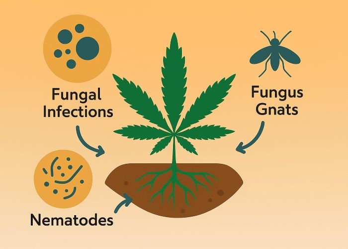 Вирощування канабісу в ґрунті пов’язане з ризиком зараження патогенами й шкідниками, особливо якщо використовувати необроблений або повторно використаний субстрат. Ґрунтові хвороби можуть сповільнити ріст, знизити врожайність і навіть призвести до повної загибелі рослин.