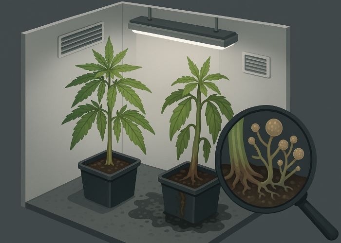 Ви коли-небудь бачили, як канабіс буквально падає замертво за кілька днів? Не просто в’яне від пересушування, не скидає кілька листків через спеку, а саме лягає, ніби хтось вимкнув у нього рубильник життя. Ні, це не кадри з фільму жахів і не перебільшення з моторошних історій для новачків — це реальність для тих, хто хоч раз стикався зі стебловою гниллю. Хворобою, що не шумить, не подає сигналів завчасно, а діє тихо, зсередини — і коли ви нарешті помічаєте проблему, рятувати вже майже нікого.