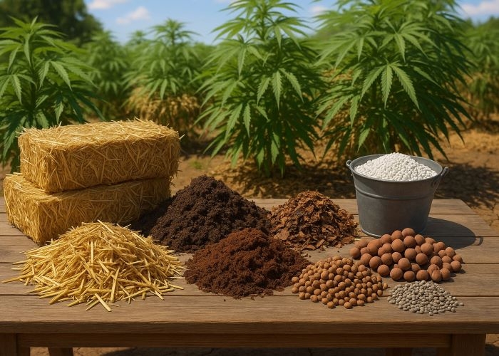 - Органічні мульчі (солома, кокос, перепрілі листя, конопляна треста) працюють краще у посушливому кліматі. Вони утримують вологу та поступово збагачують субстрат.